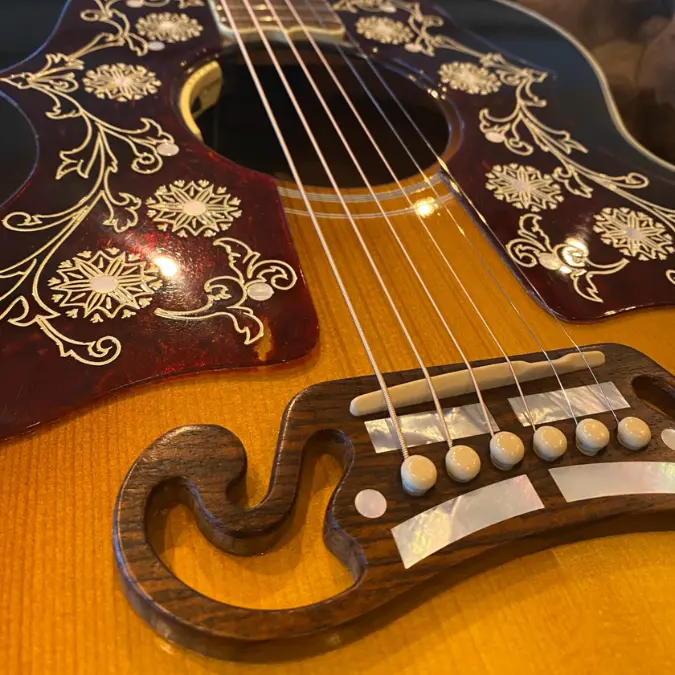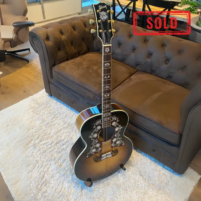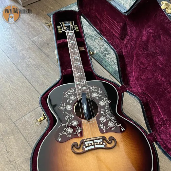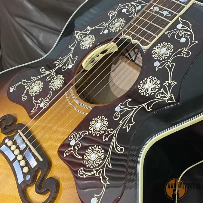 This wonderful folk acoustic guitar is now out for sale. The Bob Dylan Player’s Edition is a custom version of the iconic SJ-200, designed and produced in collaboration with the Folk legend Bob Dylan. Produced in a limited number of units between 2014 and 2017, highly collectible, this model has flamed maple back and sides, top in Adirondack sitka spruce, hand scalloped X-bracing, Indian rosewood moustache bridge and fingerboard, mother of pearl inlays, adjustable truss rod, and LR bags anthem under saddle pick-up.