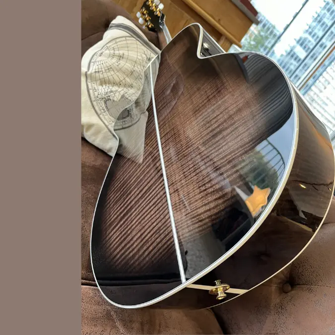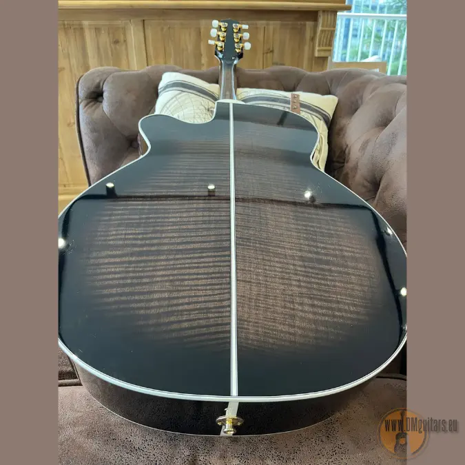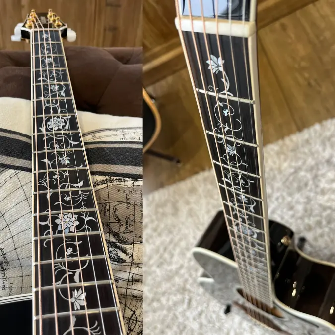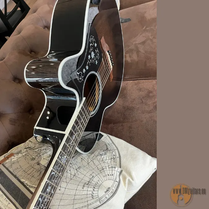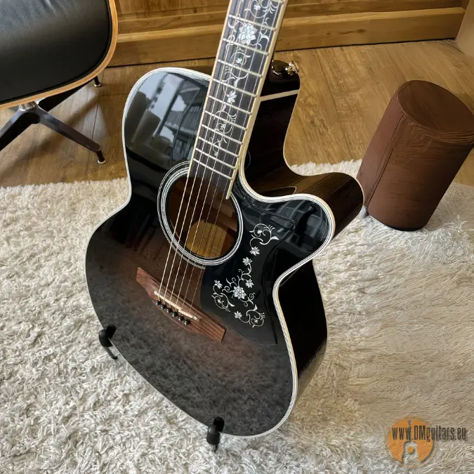 This beautiful NEX model is an addition to Takamine’s growing TT Series of “Thermal Top” acoustics. The spruce tops are treated with high heat, modifying the resins and sugars in the wood. This imparts a played in vintage tone and feel that is surprising in a brand new instrument. The EF450C TT TBB is a tastefully ornate instrument, incorporating “Grass Flower” inlays made from hundreds of pieces of abalone and pearl. The neck is made of maple with an ebony fingerboard. The nut width is a comfortable 42.5mm width, a fast and easy playing width. The body features beautifully flamed maple on the back and sides, giving the player a bold and articulate voice. Like the other guitars in the TT Series, it features the stealthy TLD-2 Line Driver preamp and Takamine’s legendary Palathetic pickup system.